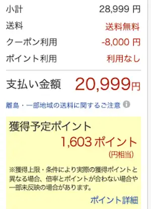 SS(スーパーSALE)限定で配布されているクーポンを適用すると、28,999円(税込)のiPlay 70 mini Proがなんと『20,999円(税込)』まで値下がり。加えて私の環境では『1,603円相当』の楽天ポイントが付与されて実質『19,396円』。