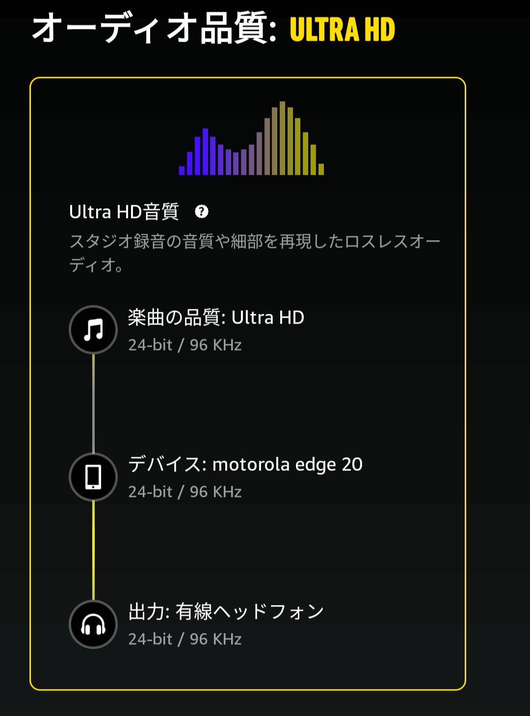 Amazon Music HDは、標準的なストリーミングサービスが提供している『10倍以上』とされるビットレートに対応。最大『24bit(ビット深度)/192kHz(サンプリングレート)』の超高解像度でスタジオレコーディングの精細な音のディテールを余すことなく再現。