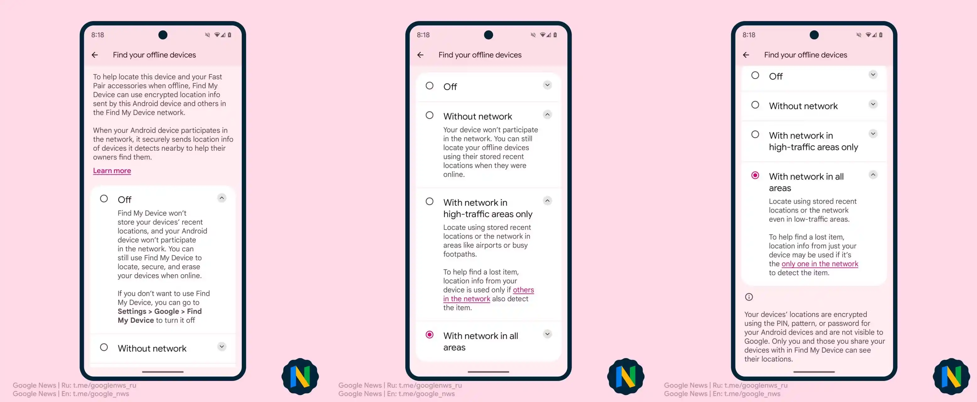 さらには『デバイスをオフラインで探す』の設定画面も。選択出来る項目は『OFF』『Without network』『With network in all areas』の3種類。