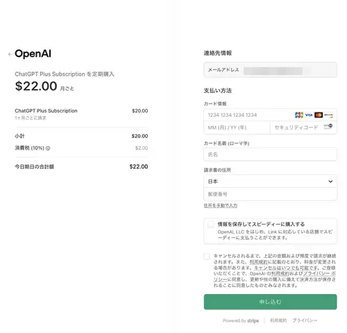 続けて『Plusを入手』を選択すると、クレジットカードによる支払い(定期購入)画面が表示。ブラウザ版からの申し込みだと、ご覧の通り『クレジットカード』しか支払い方法の選択肢がありません。