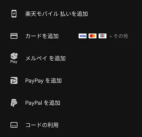 アプリの場合は、クレジットカード以外に『Google Playの残高』『楽天モバイル払い(キャリア決済)』『メルペイ』『PayPay』『PayPal』など複数の候補から支払いを選ぶことが出来ます。