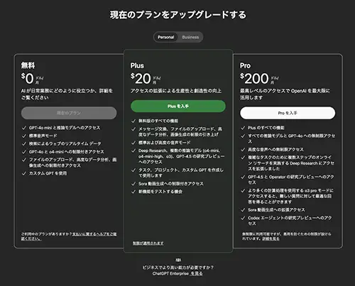 OpenAI社のチャットボット『ChatGPT』は、個人向けに『無料』『Plus』『Pro』と3つのプランを用意しています。主な違いは下記の通り。
