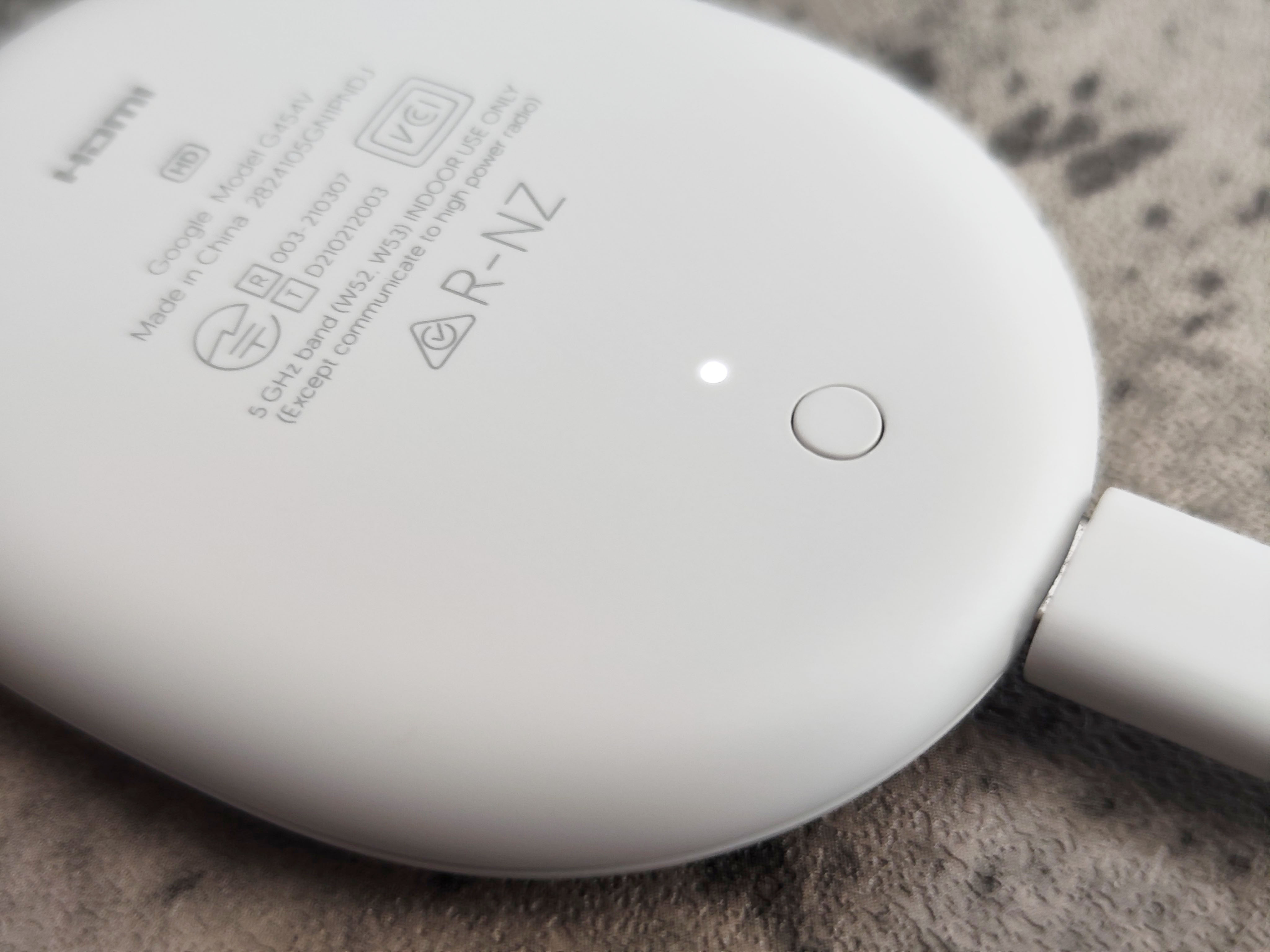 Chromecast with Google TV本体の背面にはLEDランプが備えられており(Fire TV Stickには無い)、ONでは明るく、ONの状態で電源ボタンを押すと半点灯へと切り替わります。