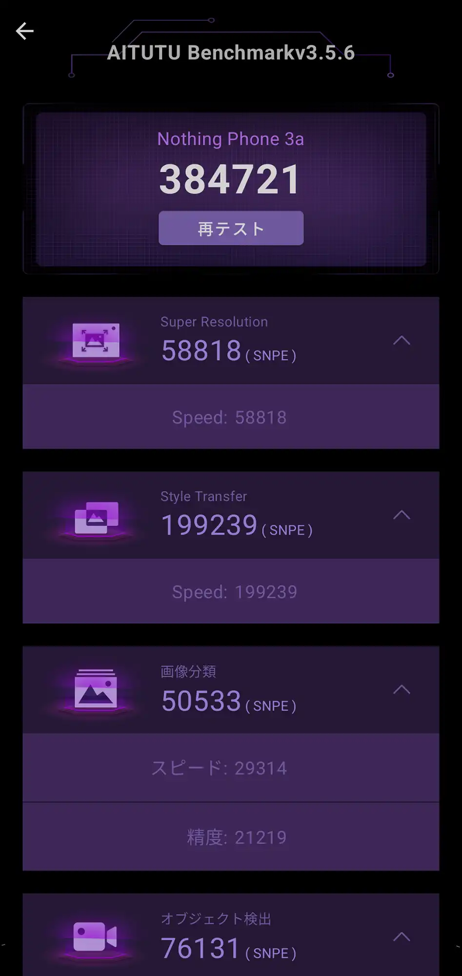 実際に『AITuTu Benchmark(V3.5.6)』でPhone (3a) とCMF Phone 2 Proのパフォーマンスを実測してみました。その結果がこちら。