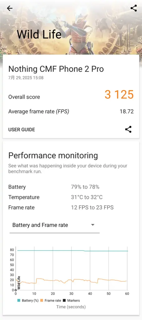 CMF Phone 2 ProのOverallscoreは『3125』。平均フレームレートは『18.72fps』となっています。どちらもPhone(3a)を下回る数値。