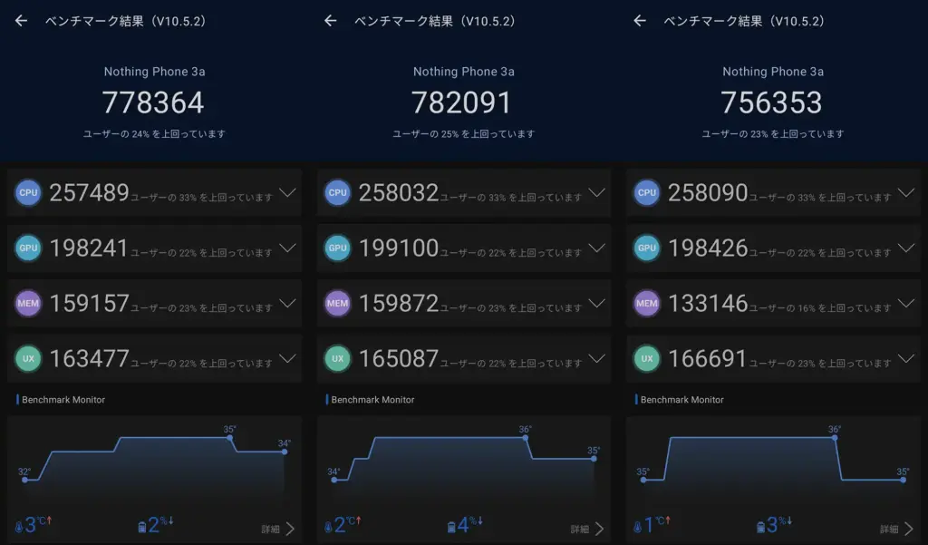 CMF Phone 2 ProとNothing Phone (3a)のAnTuTu Benchmark(V10.5.2)実測結果まとめ(上から1回目、2回目、3回目)