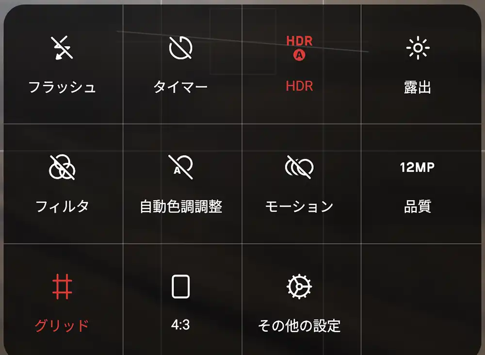 - 詳細設定(フラッシュ、タイマー、HDR、自動色調調整、モーション、解像度、グリッド、比率、スタンプ)