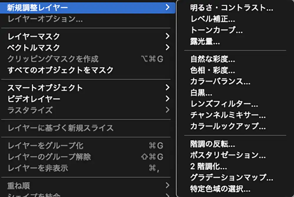 Photoshopで読み込み、『レイヤー』から『新規調整レイヤー』を作成。