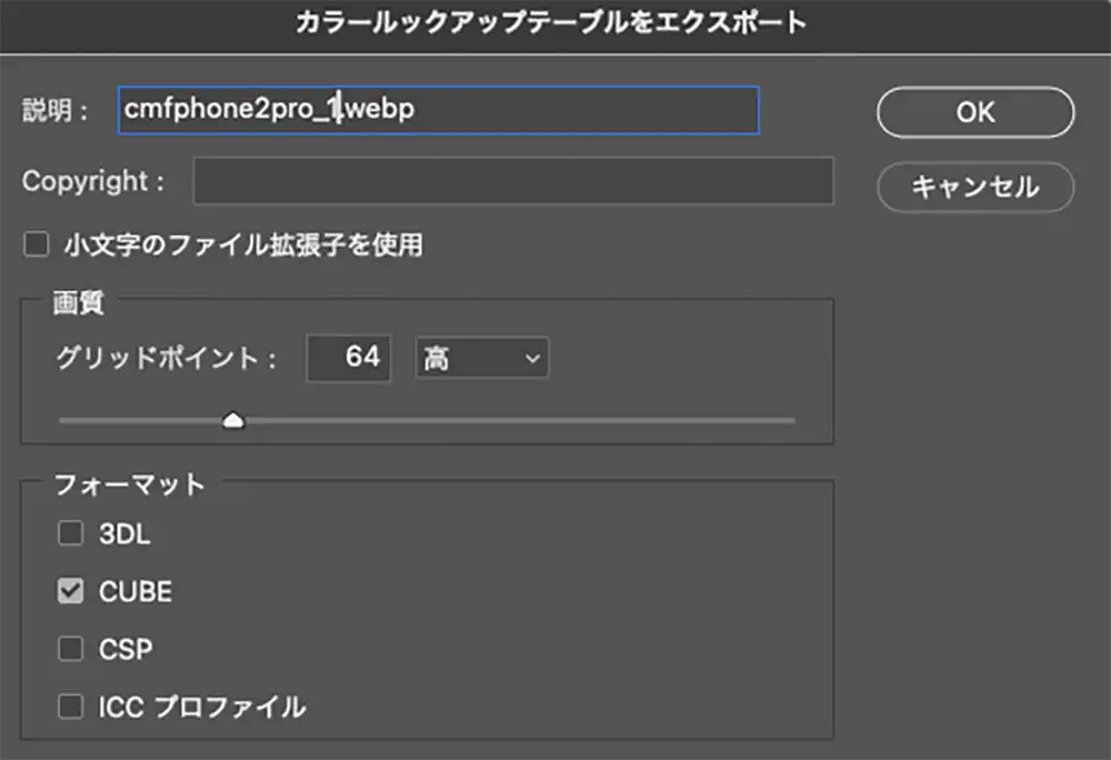 画質を『64』に設定し、フォーマットは『CUBE』にチェックを入れて出力。