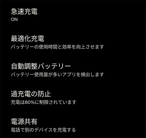 急速充電ON/OFF以外に、『最適化充電』『自動調整バッテリー』『過充電防止』『アイドル状態のバッテリーの改善』『バッテリーセーバー』といった様々な『電池いたわり機能』も備えます。