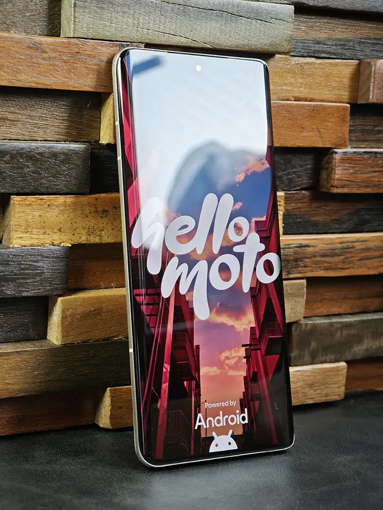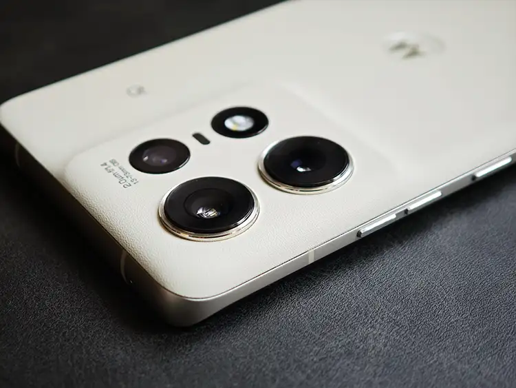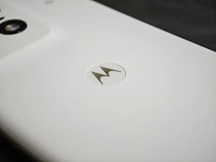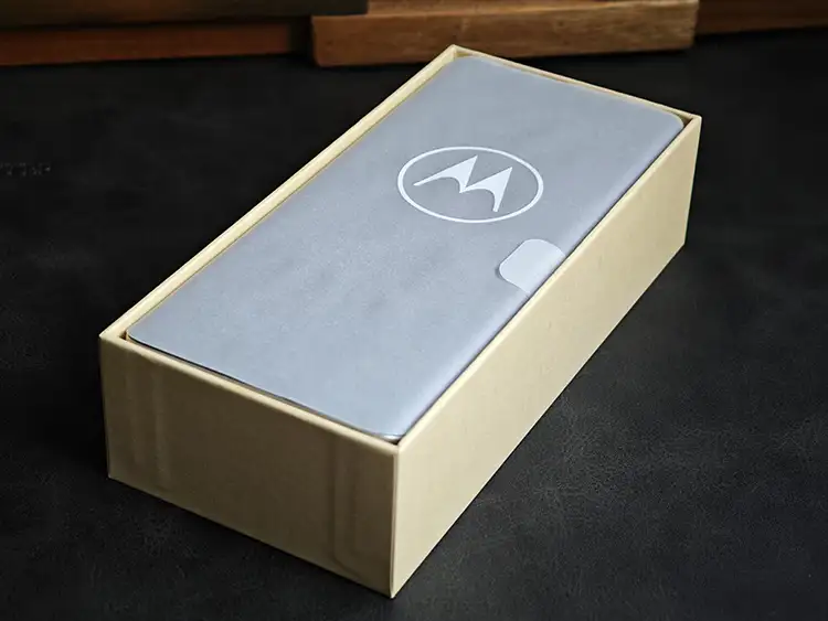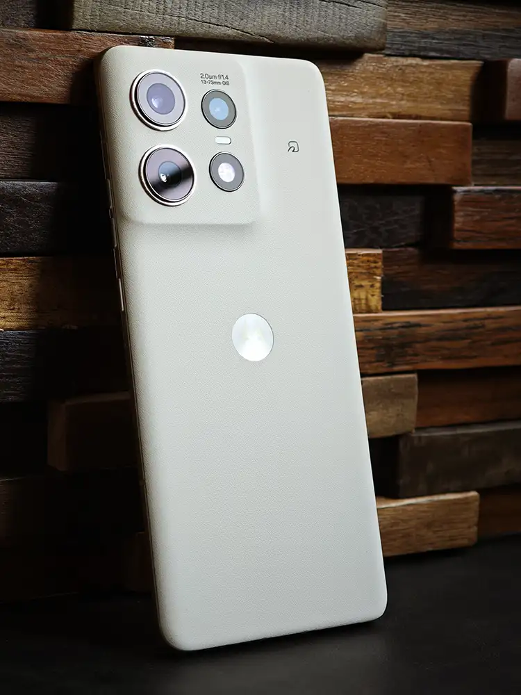 私が購入したのは『バニラクリーム』というカラー。ヴィーガンレザー仕上げが施されており、『高級車の内装』が頭に浮かぶラグジュアリーな雰囲気。見た目だけでなく手触りも『レザー』です(指紋が目立たない)。Motorolaの『M』マークが高級感を底上げ。