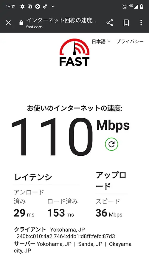 edge 50s Proを使用して楽天モバイル(Rakuten最強プラン)の通信速度をfast.comで実測(2025年6月4日午後4時12分)