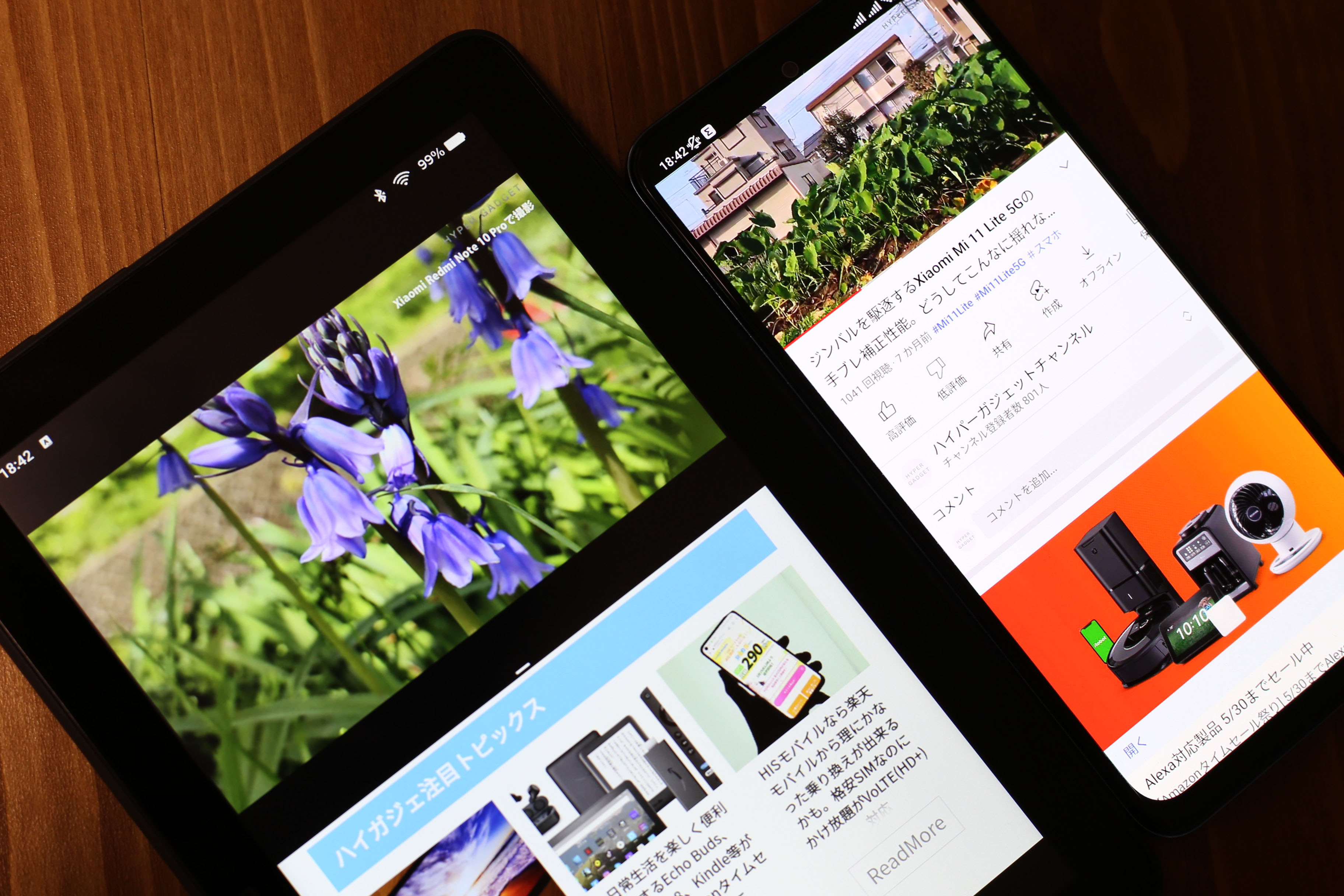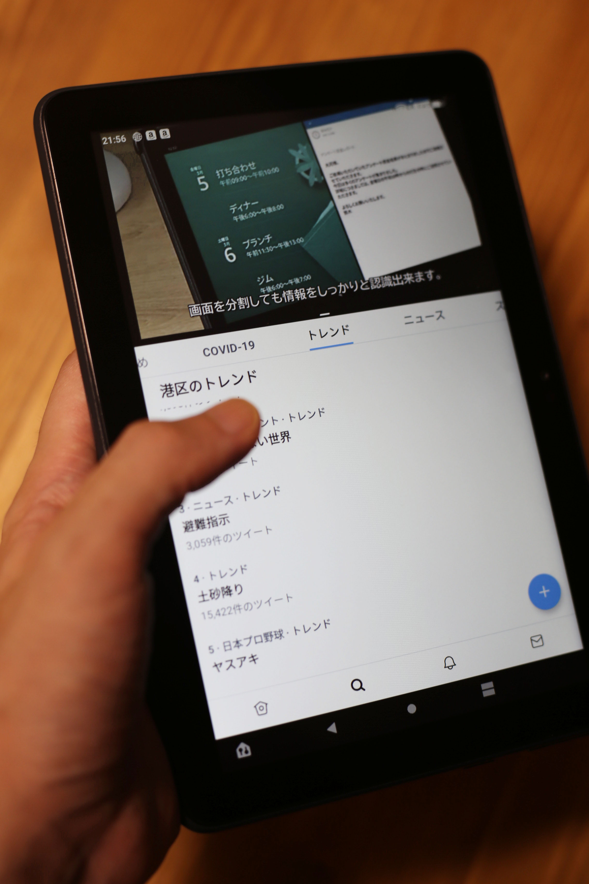 Fireタブレットは2つの対応アプリを同時に表示する『画面分割』に対応しています。スマートフォンでもお馴染みの機能ですが、最近のスマートフォンはアスペクト比『20:9』程度の縦長比率が主流。『16:9』比率がメインの動画はかなり表示が小さくなってしまいます。