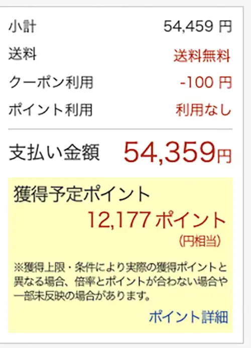 - 楽天銀行+楽天カード(+0.3倍):148ポイント