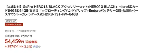 先日チェックした際には、セール特価が『54,459円(税込)』で楽天ポイント還元が『4,157ポイント(買い物をする環境によって異なる場合あり)』という状況でした。実質価格は『50,302円』でGoPro HERO13 BLACK単体の市場最安値に相当。十分安いです。