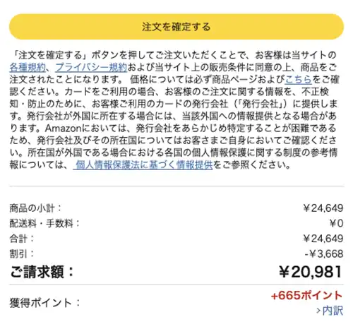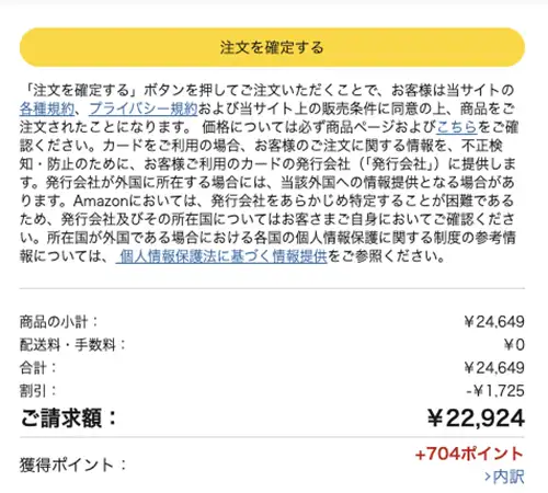 24,649円・・・だと思ったのですが、カートに入れてみると違いました。さらに『-1,725円』の割引が適用されて『22,924円(税込)』だと(プライム会員がAmazon Mastercardで決済すると704円相当のポイント付与)!?何の割引か分からないけど、売り切れそうなので買ってしまいました。