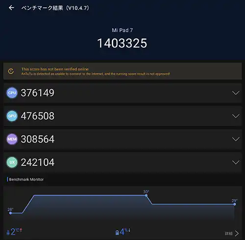 Xiaomi Pad 7(Snapdragon 7+ Gen 3) のAnTuTu Benchmark(V10.4.7)スコア実測(3回目)