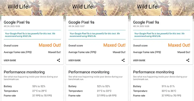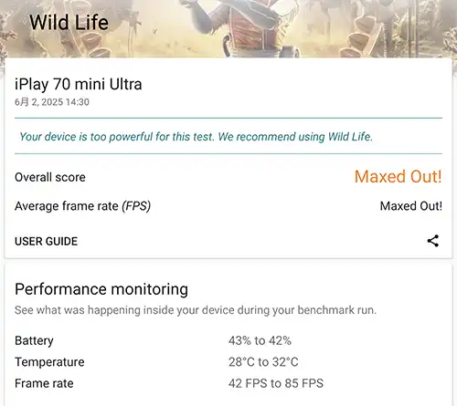 iPlay 70 mini UltraはGPU性能が高く、3DMark(Wild Life)のフレームレートは『Pixel 9a』『Nothing Phone(3a)』を上回る『42〜85FPS』を記録。