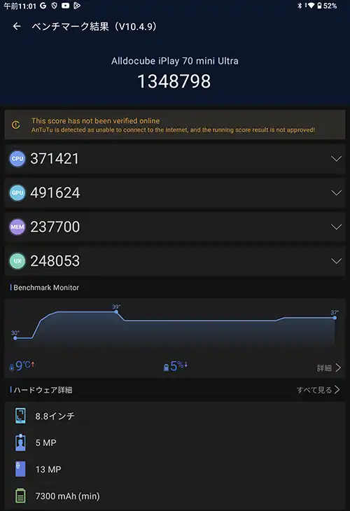 格安タブレットメーカー郡から性能で突き抜けたのが、ALLDOCUBEの『iPlay 70 mini Ultra』。SocにQualcomm社の『Snapdragon 7+ Gen3』を搭載し、代表的なベンチマークアプリ『AnTuTu Benchmark』のトータルスコアは実測値で130万超え。