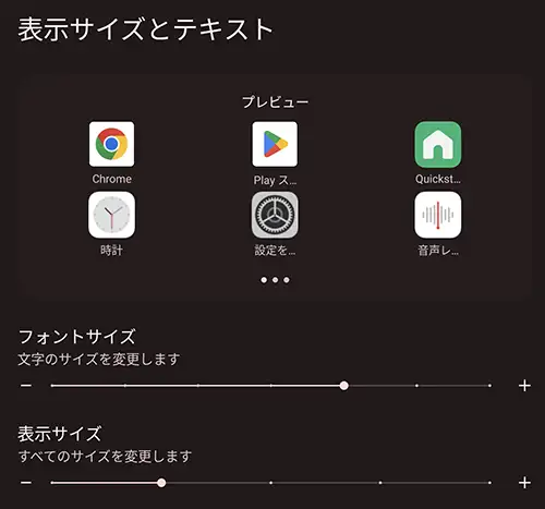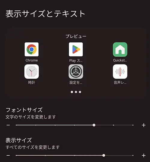 その場合は『設定』→『ユーザー補助』→『表示サイズとテキスト』から『フォントサイズ』『表示サイズ』を調整すればOKです(ブラウザ側で文字サイズを設定出来る場合あり)。