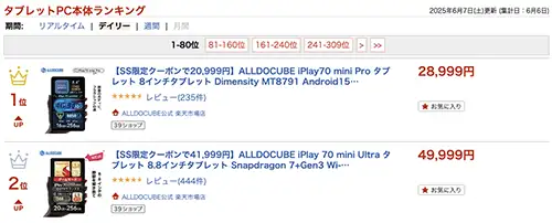 2025年6月7日時点の『楽天市場タブレットPC本体デイリーランキング』では、ALLDOCUBEの『iPlay 70 mini Pro』『iPlay 70 mini Ultra』が1位と2位を独占。