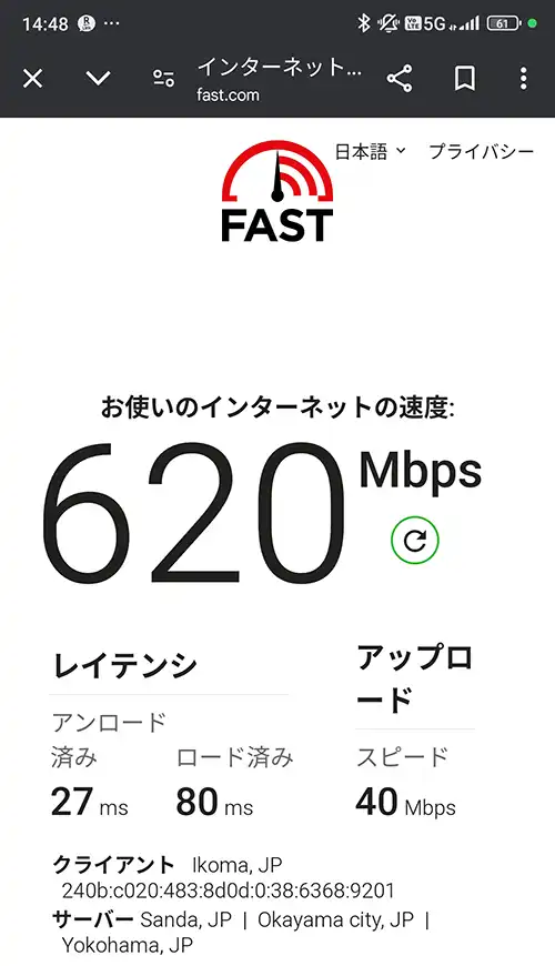 Xiaomi 13Tを使用して楽天モバイル(Rakuten最強プラン)の通信速度をfast.comで実測(2025年4月27日午後2時48分)