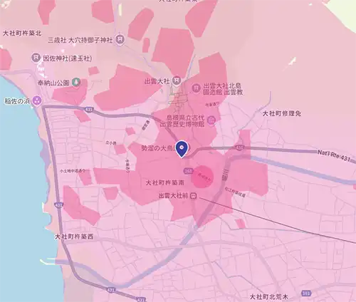 ただし高周波は『直進性』が強いので、遮蔽物の影響を受けて『減衰しやすい』という特性も。出雲大社の勢溜(せいだまり)付近には楽天モバイルの基地局があり、かつ遮蔽物が少なかったので、人の往来が多くても『620Mbps』を記録出来た可能性が高いです。
