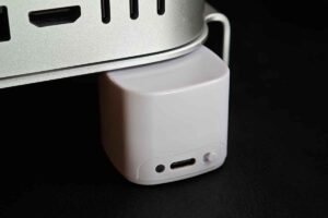 Mac mini(M4)の電源ボタン対策として、Amazonで最初に見つけたのがコチラ。本体にフィット(?)するであろう形状で、上のボタンを押すと下の可動部分が上がり、電源ボタンを押すという単純明快な作り。