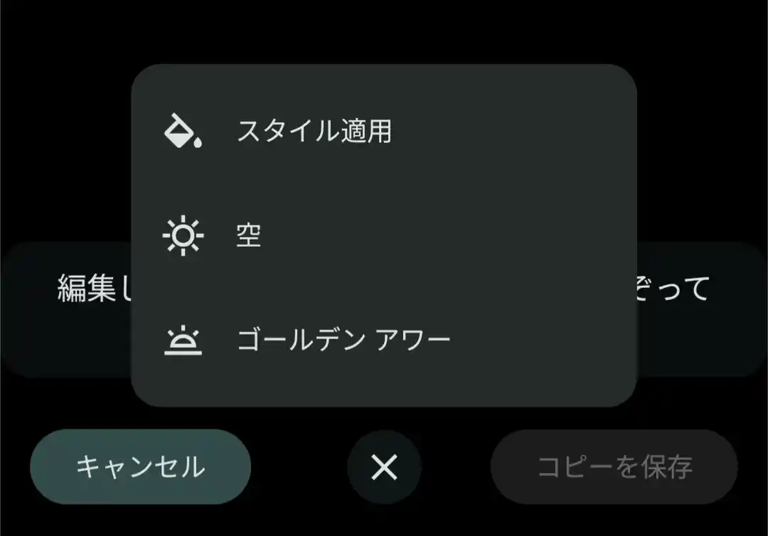 画像を表示させた状態で、何も選択せずに虹色アイコンをタップ(被写体によっては表示されない)すると、『スタイル適用』『空』『ゴールデンアワー』といった項目が表示。
