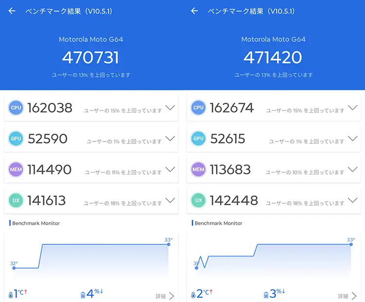 moto g64 5G(Dimensity 7025) のAnTuTu Benchmark(V10.5.1)スコア実測結果(左からRAM拡張4GB、RAM拡張OFF)