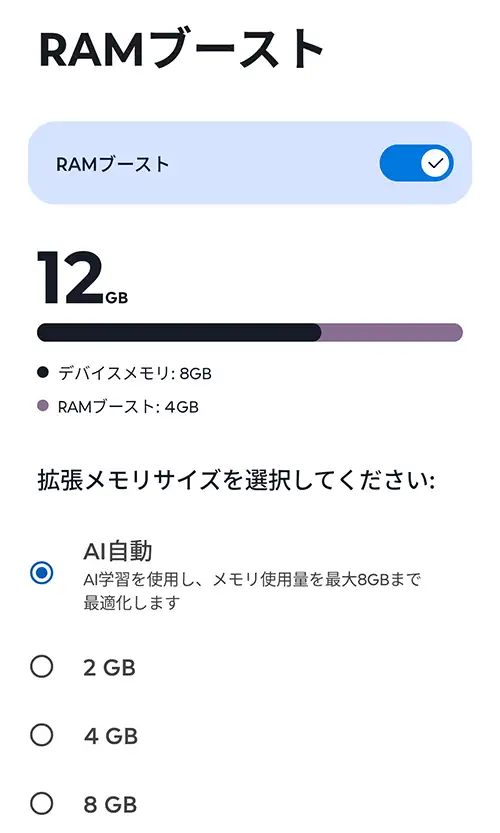 2025年7月6日時点で、Androidのバージョンは『15』。いつの間にかRAMブースト(ストレージの一部をメモリに代用する機能)に、『AI自動』という項目が追加。
