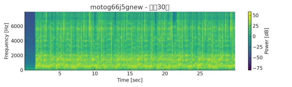 moto g64 5Gは『中域と高域(約3kHz〜6kHz)』を強調。低域は弱めとなっています。対してmoto g66j 5Gは『中域〜中高域(約1kHz〜6kHz)』にかけてバランスの良い音像。