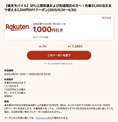 私の買い物環境では『1,000円OFFクーポン』も利用可能でした。詳細を調べてみると『SPU上限到達および到達間近の方へ!先着50,000注文まで使える1,000円OFF(2025/6/20~6/30)』という内容。