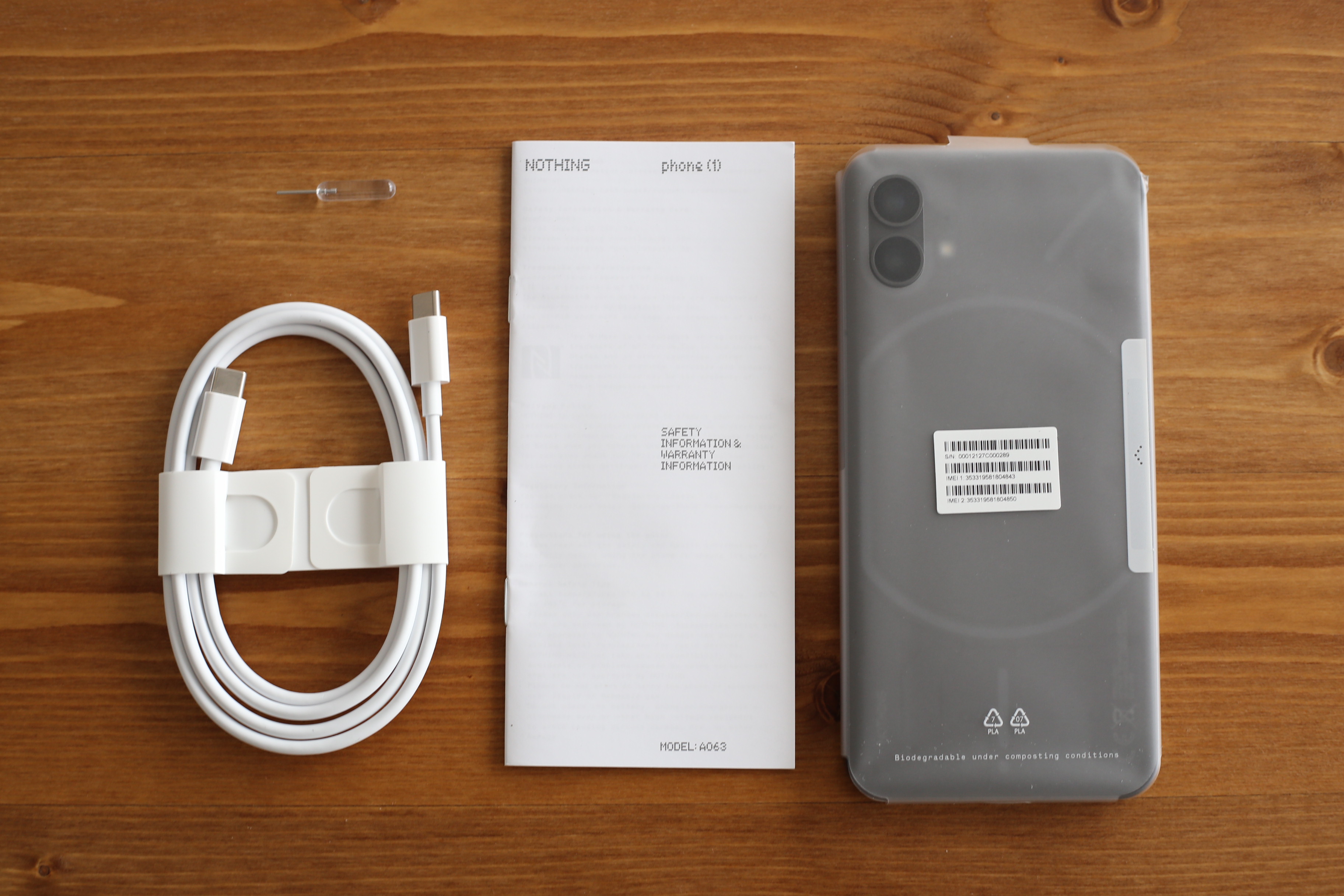 パッケージの中身がコチラ。SIMピン、USB充電ケーブル、冊子、本体。SIMピンは本体に合わせたスケルトン仕様。充電器は付属しません。