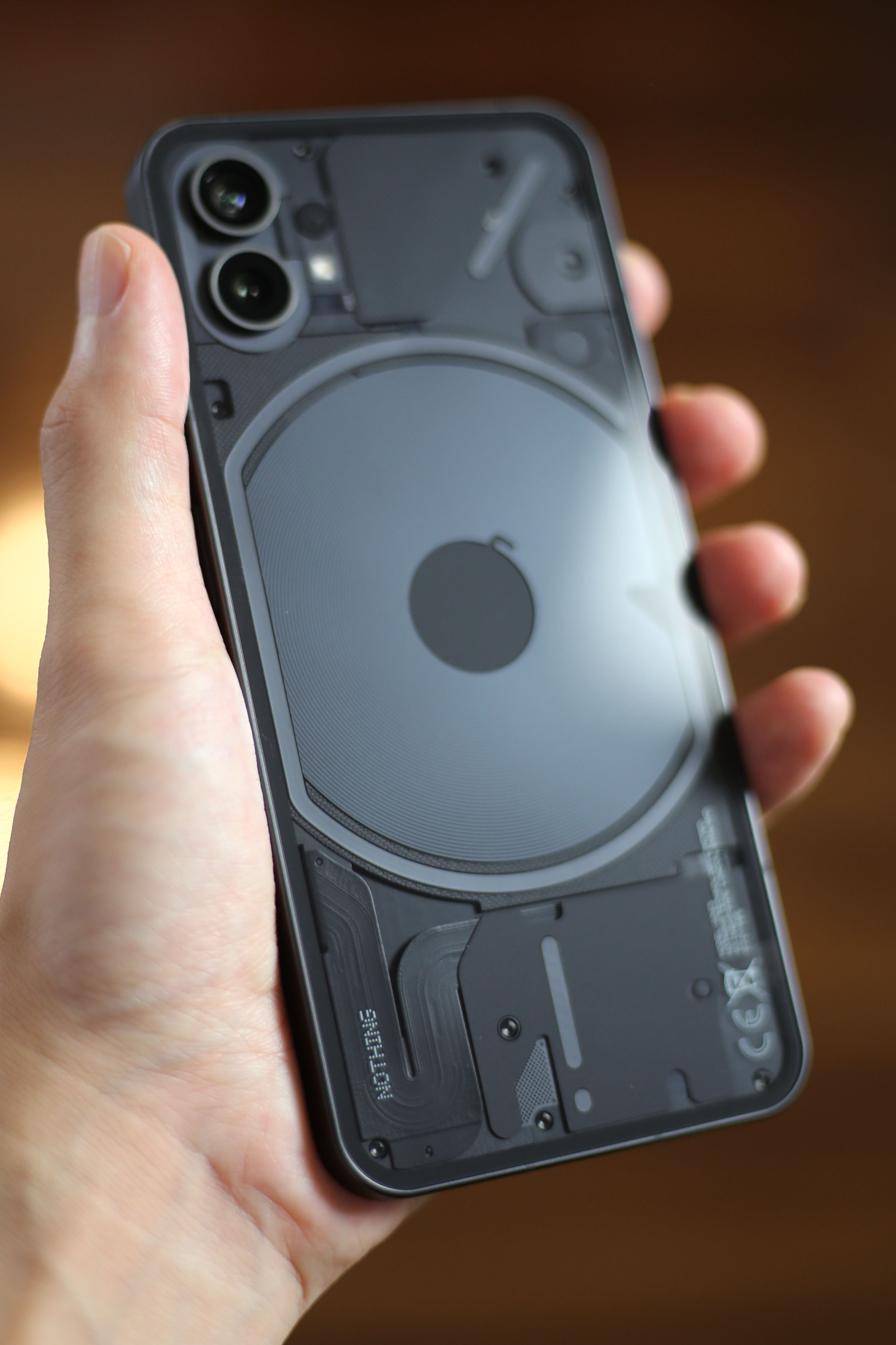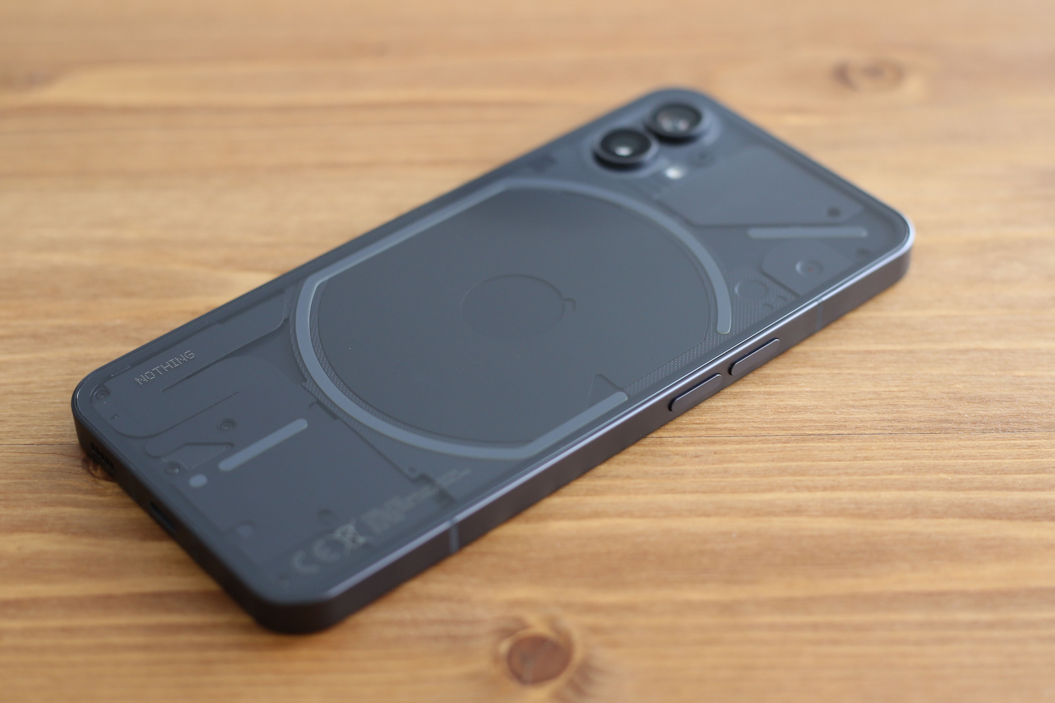 手に持ってみるとそれなりの重さ。『約193.5g』は軽い部類に入りません。スマートフォンの重みは『不快感』『高級感』のどちらかに分類。Nothing Phone (1)やiPhoneは完全に後者。これで軽かったら『おもちゃっぽさ』が出てしまうでしょう。
