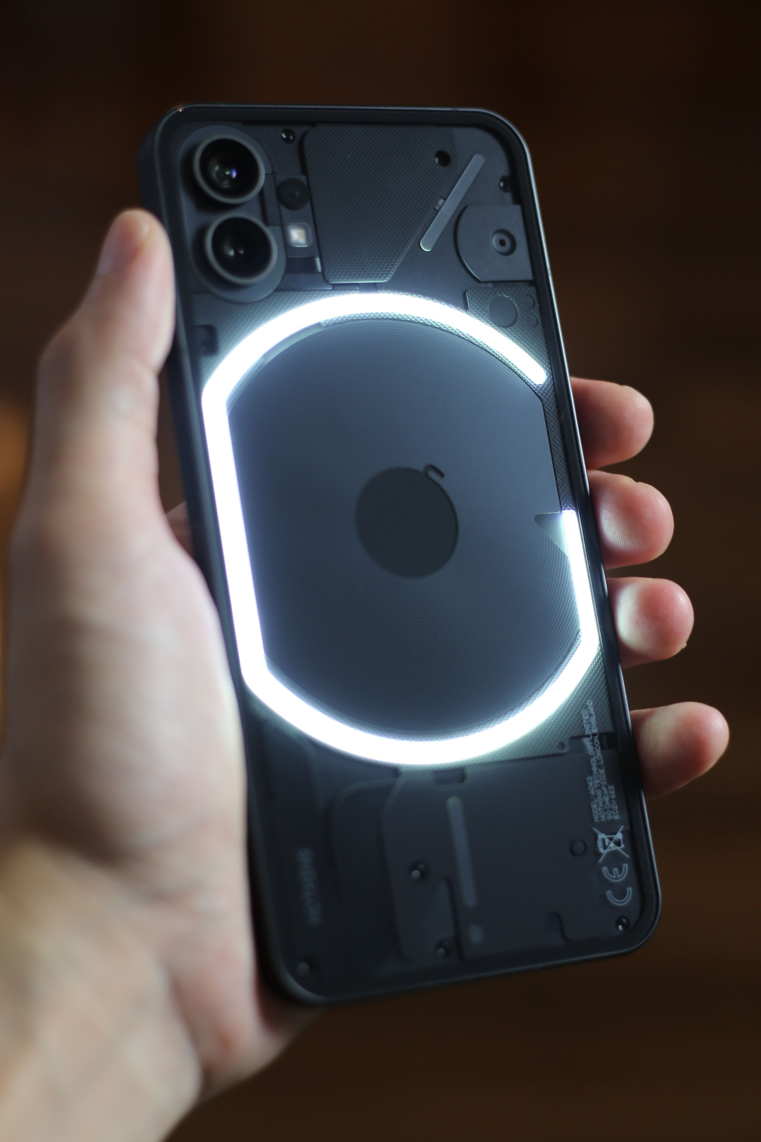 最近はアルミフレームにガラス素材を合わせたフラットデザインのスマートフォンが増えていますが、Nothing Phone (1)は光るの反射するガラスの隙間から立体的な造形を楽しめるアート仕様。あまりの美しさに何度もチラ見。