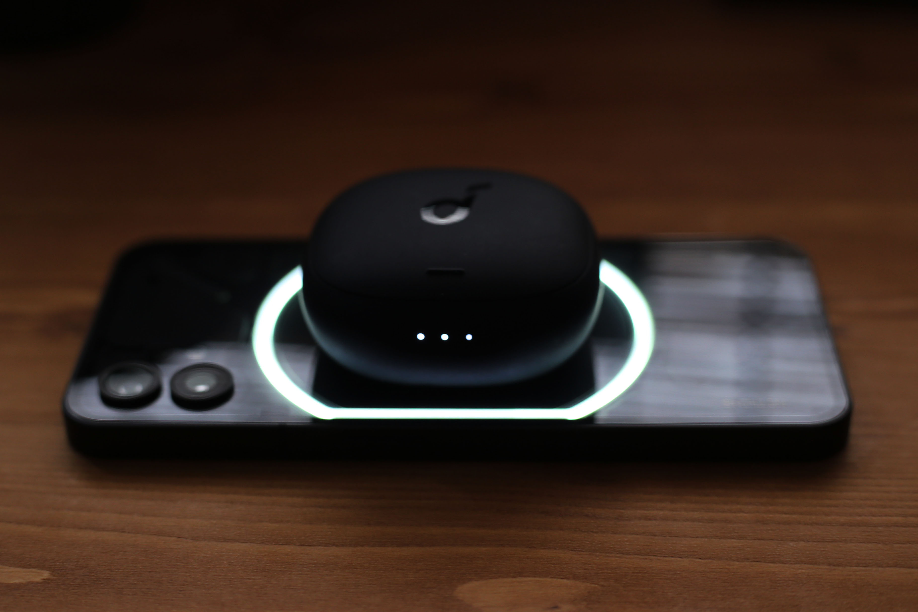 『バッテリーシェア(上部スライドメニューから選択可能)』をONにした状態で対応機器をNothing Phone (1)の背面にのせると、サークル部分が光って充電を開始。これまた格好良い。こんなの見せられたら同社のBluetoothイヤフォン『Nothing ear (1)』を欲しくなってしまうじゃないか。