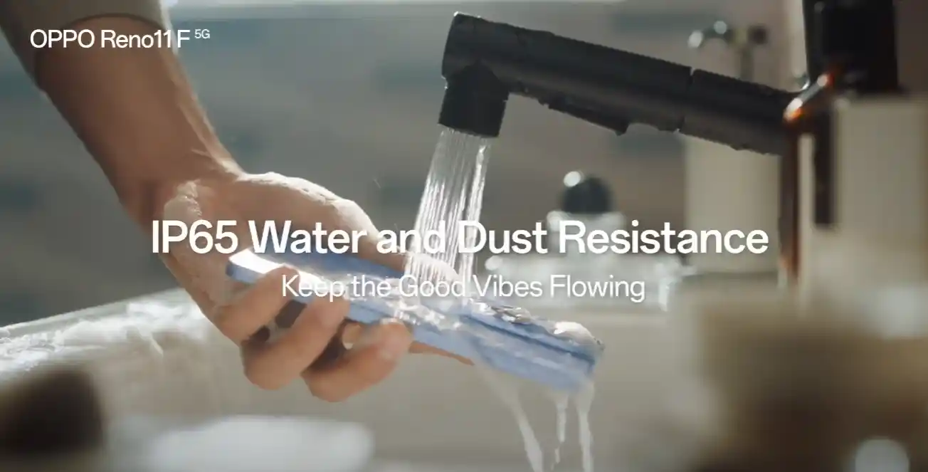 海外版の『OPPO Reno11F 5G(IPX5)』向けには、更に強気の広告動画をプッシュ。なんと粉がかかったOPPO Reno11F 5Gを水でジャブジャブと洗っています。