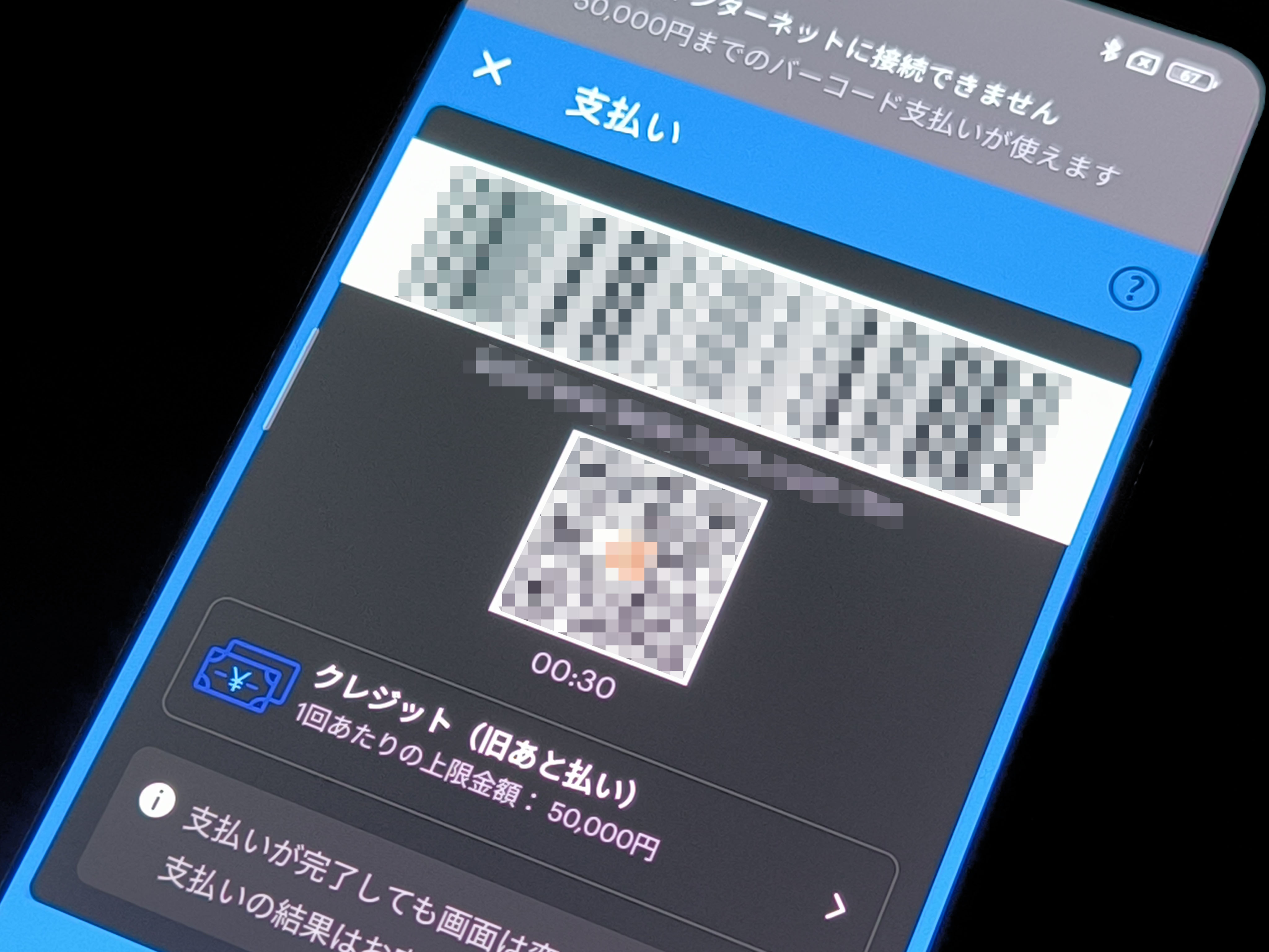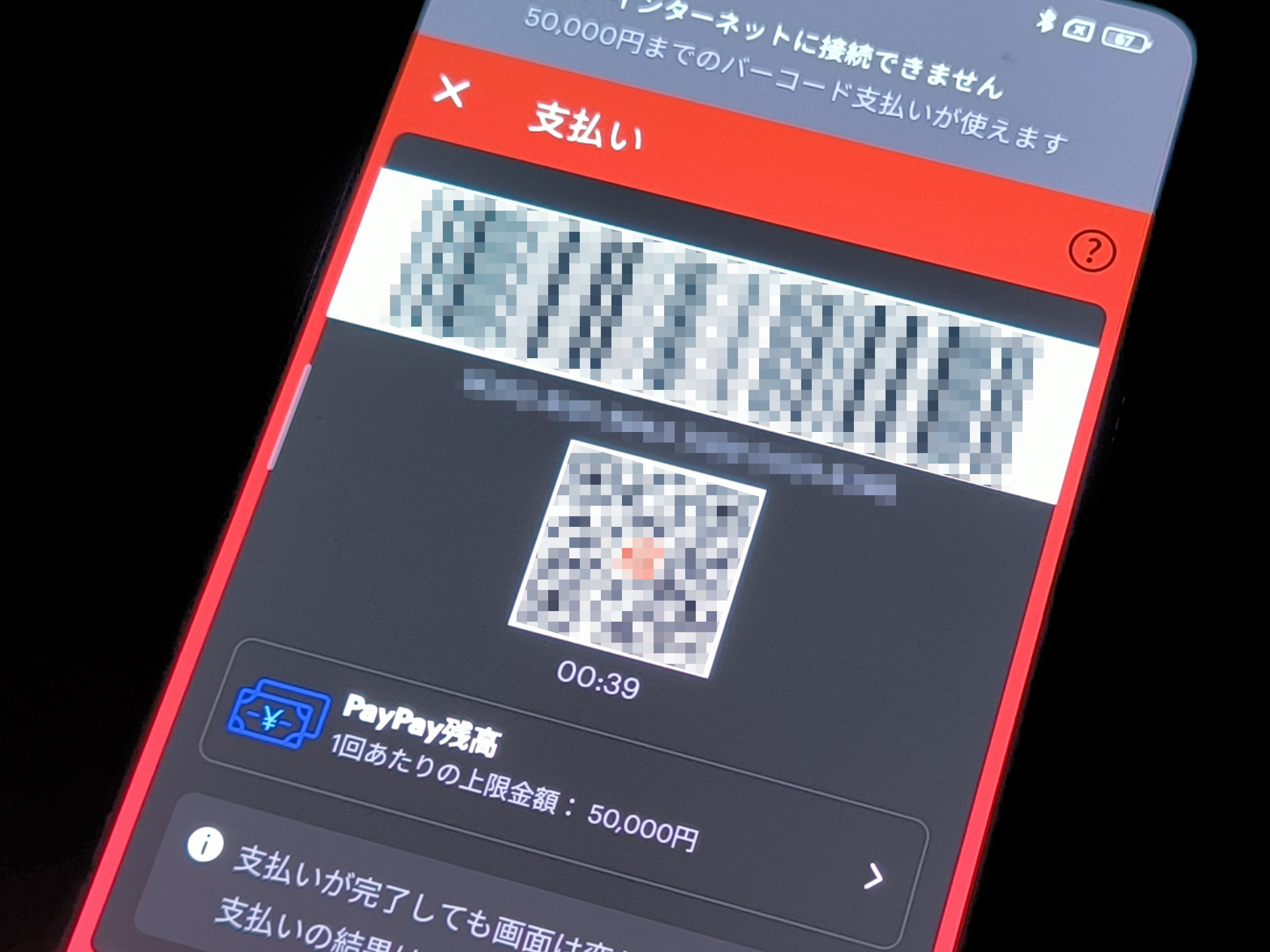 上記の条件をクリアした状態でPayPayアプリを起動(通信環境なし)すると、『インターネットに接続出来ません』と表示され、『オフラインモードで支払う』の選択が可能に。