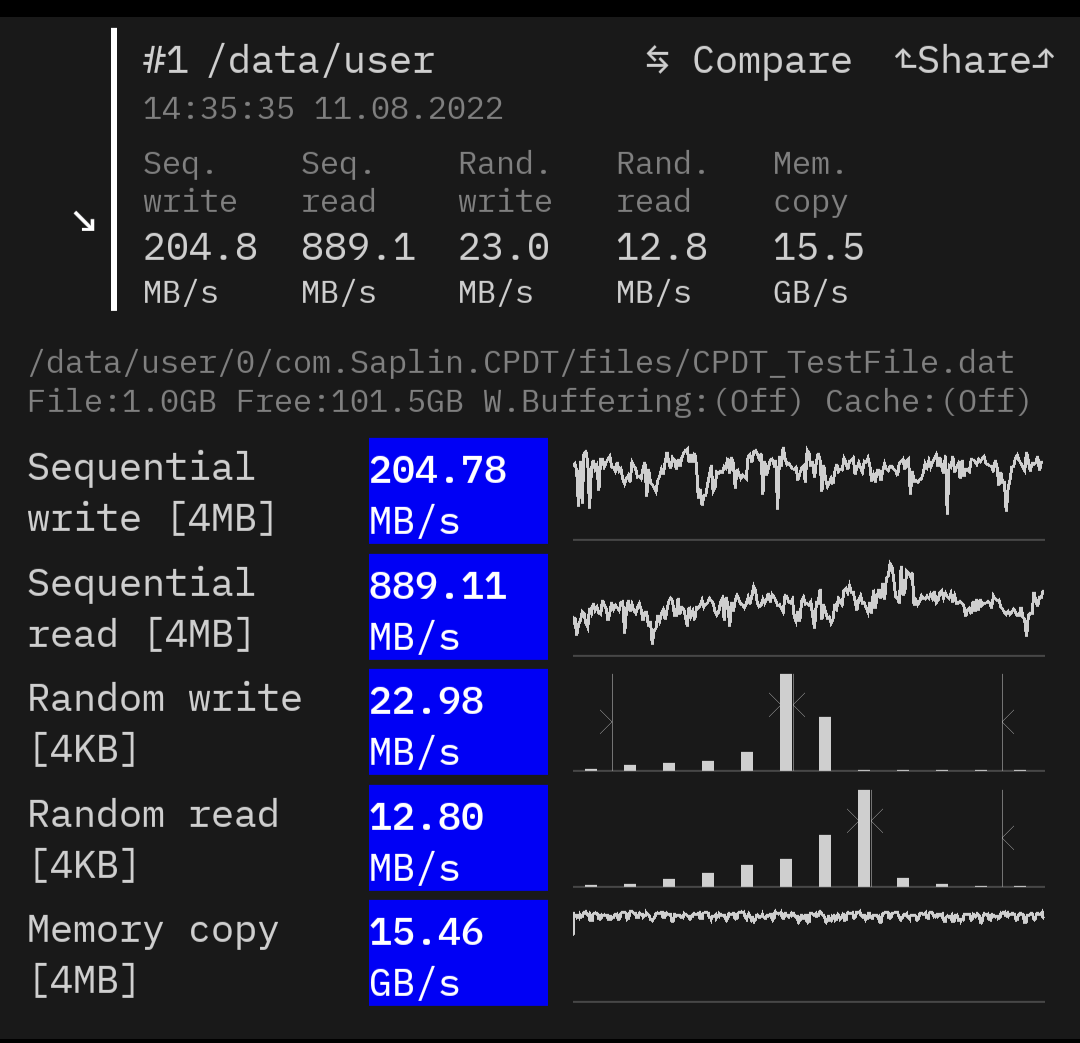 最高性能が高いのは間違いないですが、ファンや充電環境が無い外出先ではパフォーマンスを落とした方が良いでしょう。暑い季節は特に。最後は『CPDT Benchmark』でストレージ、メモリの性能を比較。
