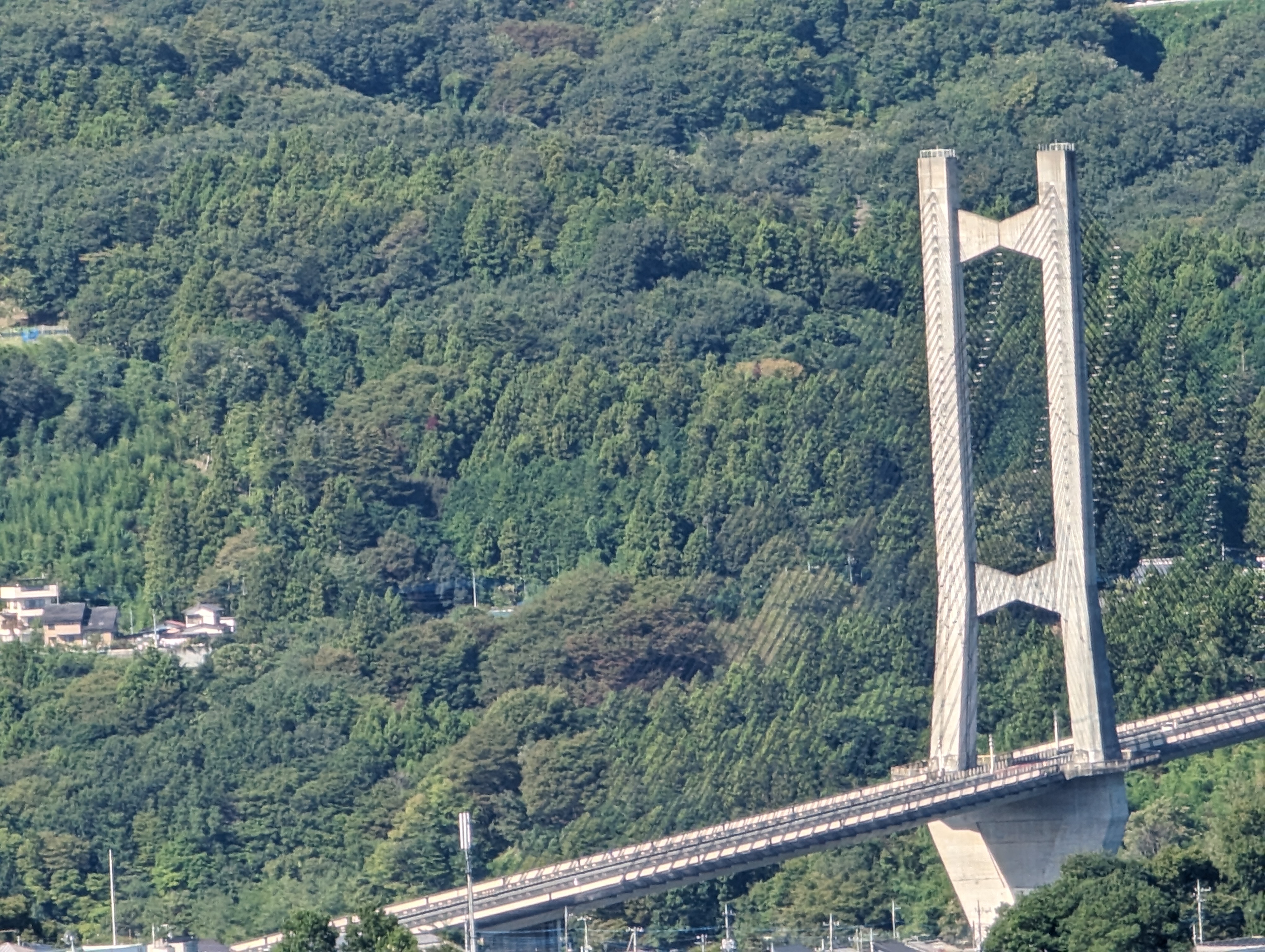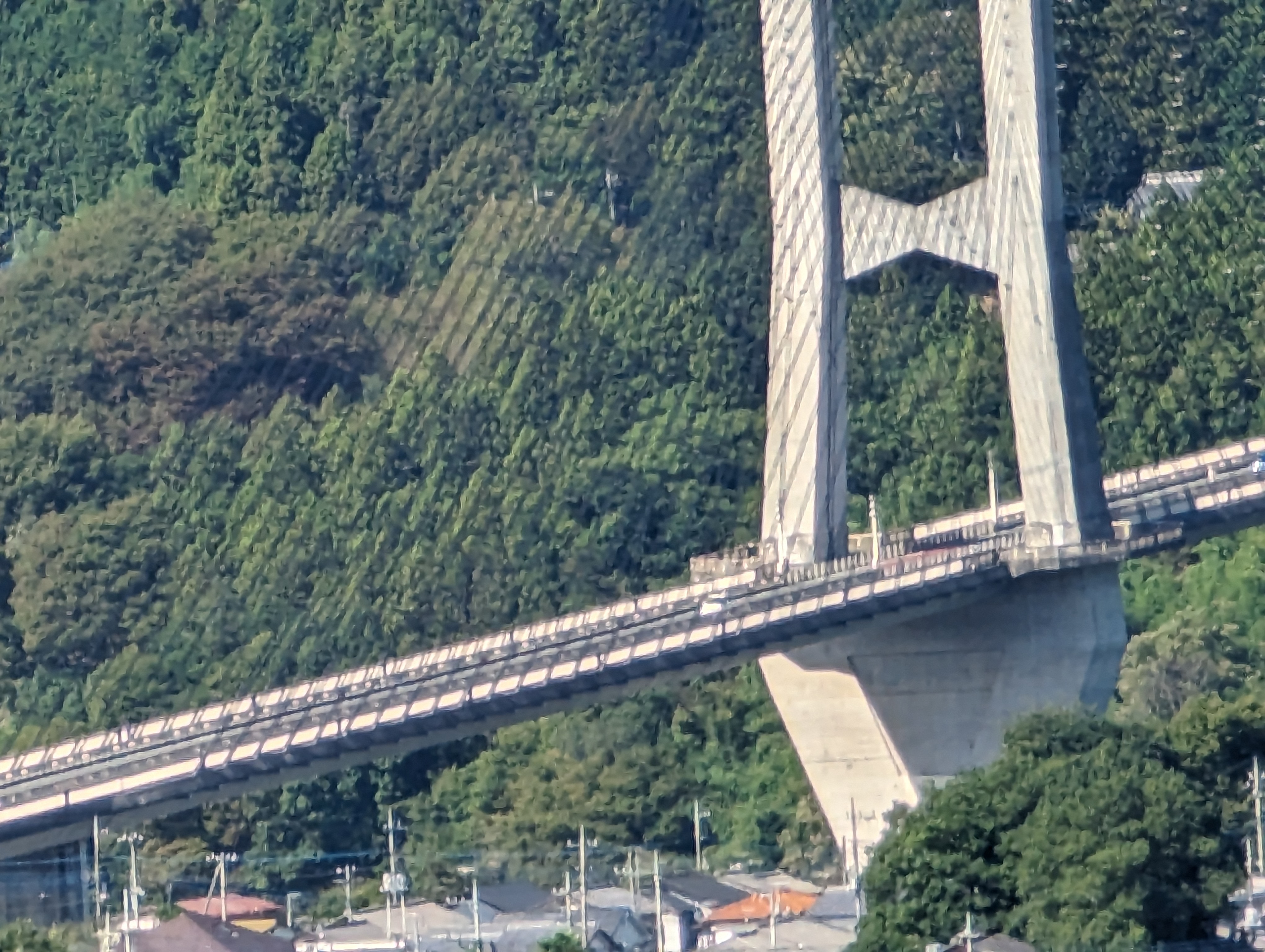 一般的なスマートフォンだとそもそも『30倍』まで倍率を高められませんし、仮に高められたとしてもディテールが崩れて被写体を認識出来ない場合が殆ど。Pixel 7 Proでは家の屋根の色や、吊り橋の形状までハッキリと分かります。