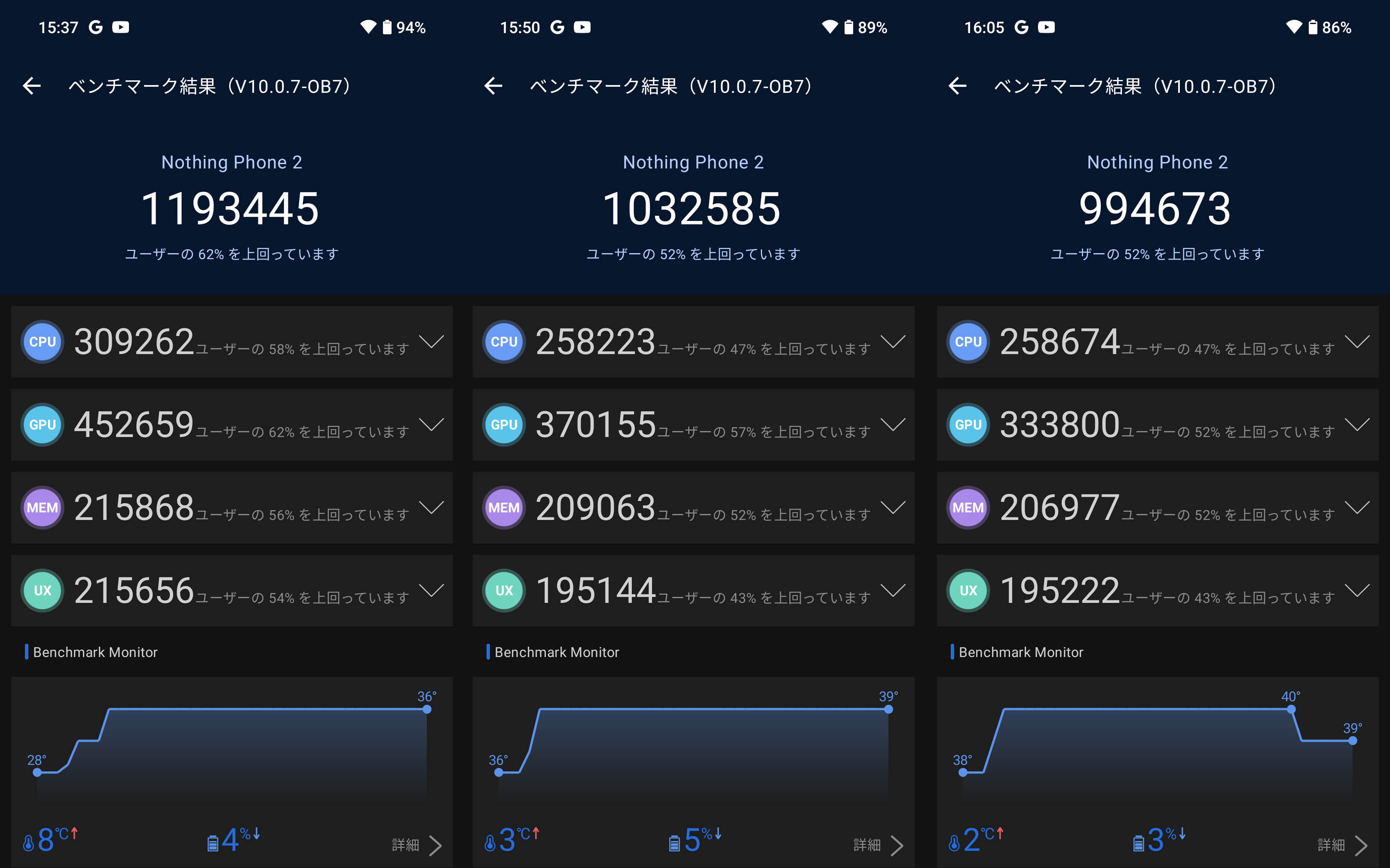 1回目は『1193,445』と、Pixel 8比較で20万近く高い数値を記録。これでも旧モデル(しかも低クロック版)です。2回目は『1032,585』までスコアを落としていますが、その分電池温度上昇は『39度』と低め。