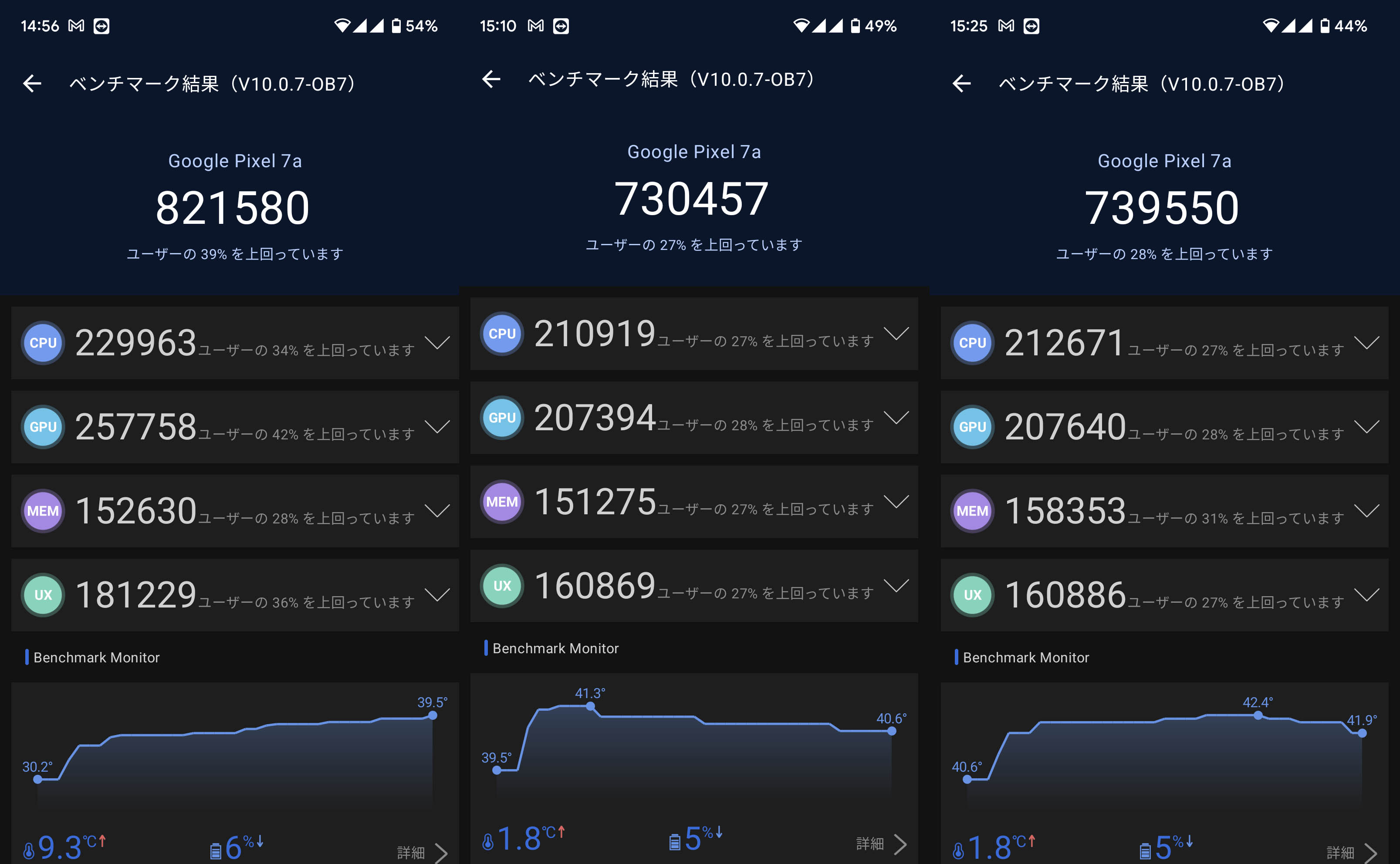 もっとも廉価なPixel 7aは1回目『821,580』、2回目『730,457』、3回目『739,550』。1回目から3回目にかけて82,030スコアが低下しています。電池温度は最高で『42.4度』まで上昇。