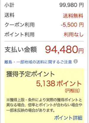 さらに私の環境では楽天ポイントが『5,138円相当(買い物環境によって異なる)』付与されるので実質『89,342円』。最上位モデルがまさかの8万円台突入!