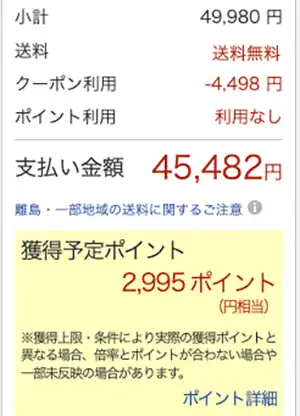 さらに楽天市場なので楽天ポイントまで追加で付与されます。私の環境では『2,995円相当(買い物環境によって異なる)』!差し引くと実質『42,487円』。どう考えてもバグ的な、悩む余地の無い安さ!