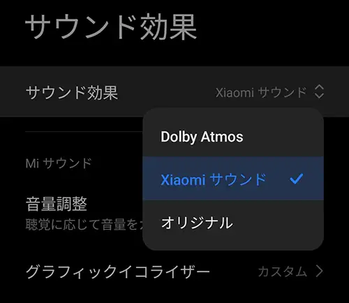 ヘッドフォンを有線接続した状態で『設定』→『サウンドとバイブレーション』→『サウンド効果』の順に開いてみると、Bluetooth接続時は表示されなかった『Xiaomiサウンド』を選べるように。