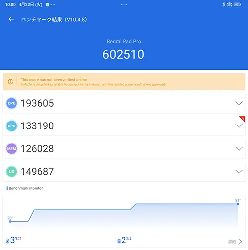 Redmi Pad ProでAnTuTu Benchmark(10.4.8)を実測