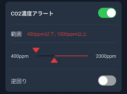 CO2センサー(温湿度計)』では、ディスプレイに二酸化炭素濃度を表示出来るだけでなく、『1,000ppm(設定値)を超えたらアラートでお知らせ』が可能。