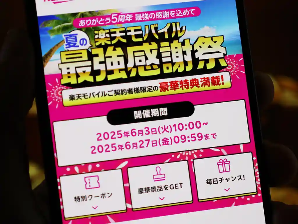楽天モバイルでは、2025年6月3日(火)午前10時〜6月27日(金)午前9時59分までの期間限定で『夏の楽天モバイル最強感謝祭』を実施。