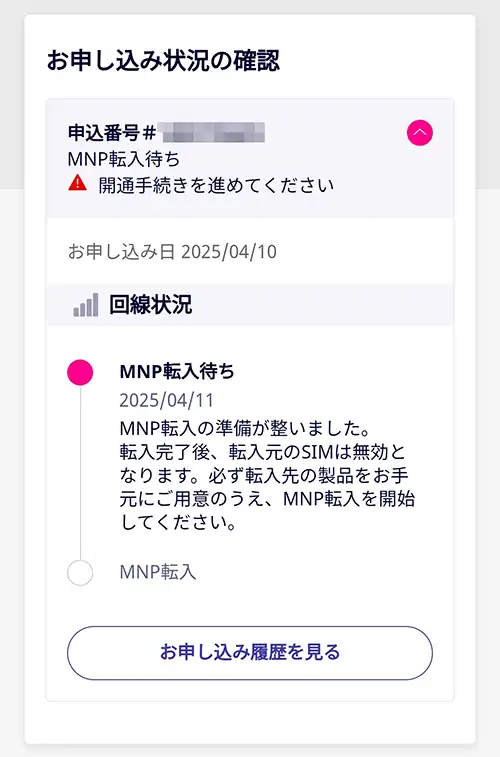 5『MNP転入の準備が整いました』という内容を確認したら、『お申し込み履歴を見る』を選択